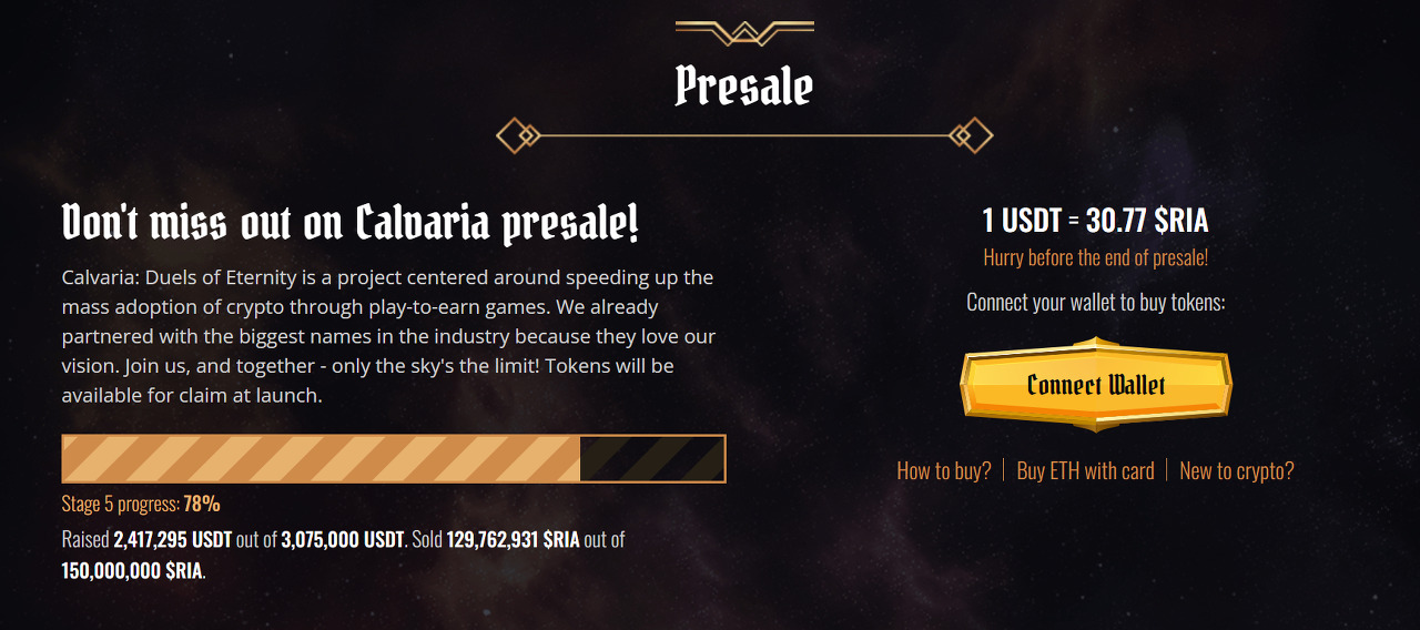 Calvaria 는 두 개의 기본 토큰으로 여러 가지 방식으로 플레이어에게 보상을 제공하는 새로운 게임입니다. $RIA 토큰은 현재 출시 이후 240만 달러 이상을 모금한 성공적인 프리세일 중입니다.