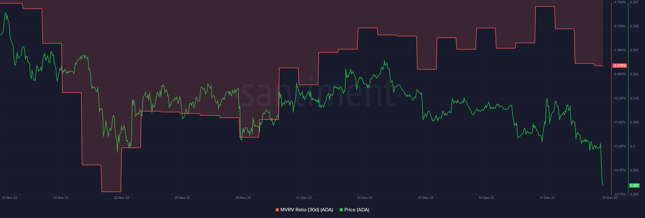 현재 -8.37인 Santiment의 MVRV(Market Value Realized Value) 메트릭에 따르면 Cardano의 가격은 현재 매수 영역에 있습니다. 이 온체인 메트릭이 1 미만으로 떨어지면 에이다(ADA)가 저평가되었음을 나타내며 투자자는 손실 실현에 대한 우려로 인해 매도를 주저할 수 있습니다.